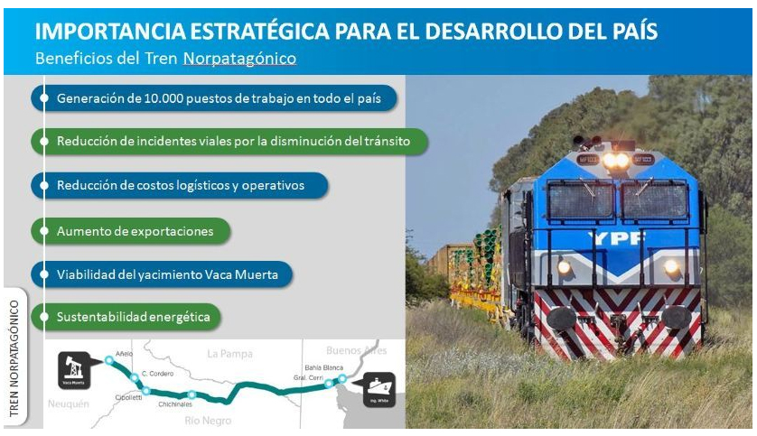 El proyecto de reactivación del ferrocarril Norpatagónico es de interés estratégico para Argentina ya que, además de reducir los costes logísticos del transporte de mercancías en la línea que conecta el yacimiento de Vaca Muerta con Neuquén, también contribuirá a reducir, en gran medida, el tráfico de camiones y las emisiones a la atmósfera en la región.
