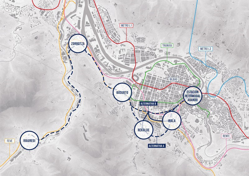 Una de las alternativas consiste en la utilización de la antigua línea de Feve conectándola, mediante sistemas de tipo funicular, con los centros de Rekalde e Irala. La otra opción, plantea una variante de trazado de la citada línea con dos nuevas estaciones en los centros urbanos de Rekalde e Irala.