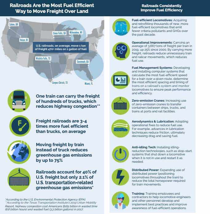 Actualmente, los ferrocarriles representan, aproximadamente, el 40 por ciento del volumen de carga de larga distancia de Estados Unidos, más que cualquier otro modo de transporte y solo el 2.1 por ciento de las emisiones relacionadas con el transporte, según los datos de la Agencia de Protección Ambiental, EPA. Si el 10 por ciento de la carga que se sirve de camiones se trasladara al ferrocarril, las emisiones de gases de efecto invernadero se reducirían en más de 17 millones de toneladas anuales, equivalentes a retirar 3,35 millones de vehículos de transporte de la carretera.