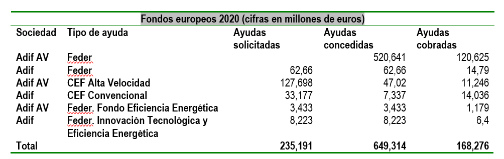 En lo referente a financiación europea, durante el año 2020 se formalizaron 649 millones de euros de ayudas procedentes del FEDER y CEF, frente a los 109,4 millones de euros formalizados en 2019. Destacan el gran Proyecto Red Básica. Línea de alta velocidad Madrid-Galicia (Tramo Lubián - Orense. Subtramo Lubián - Taboadela Fase I), así como el tramo Antequera-Granada (Plataforma Fase III, suministros, montaje de vía, electrificación, e instalaciones) o el Corredor Atlántico, la Línea de alta velocidad para tráfico mixto Madrid-Lisboa (Vía, Electrificación e Instalaciones Fase II).