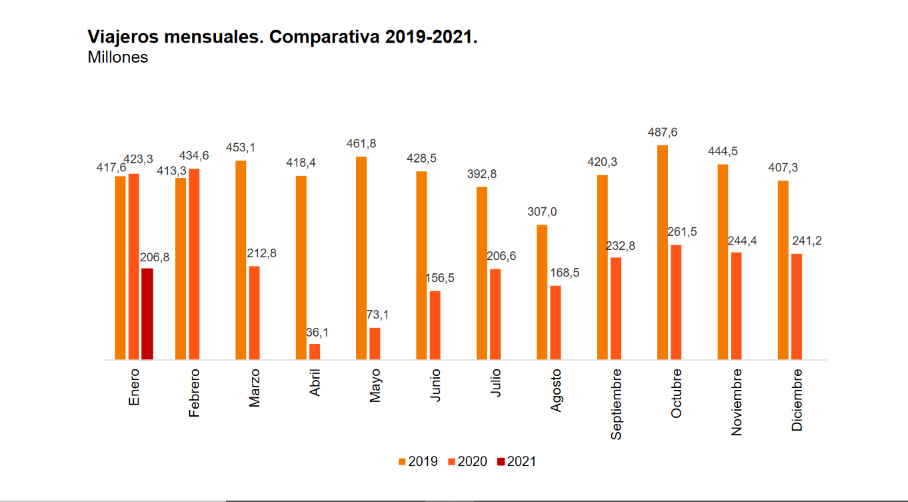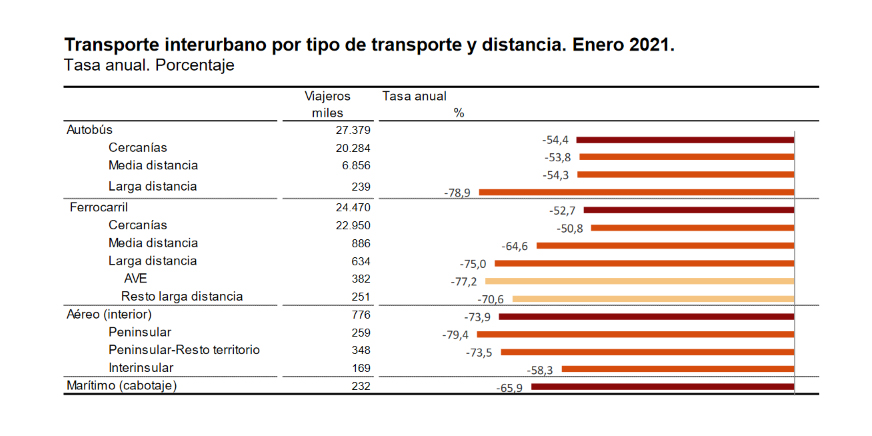Los datos provisionales publicados por el Instituto Nacional de Estadística revelan que el número de viajeros del transporte público durante el pasado mes de enero decreció un 51,1 por ciento respecto al mismo mes de 2020, con motivo de la disminución de la movilidad derivada de la crisis sanitaria del coronavirus. Dicho descenso de la demanda afecta a todos los modos de transporte y, en el caso del ferrocarril, fue del 52,7 por ciento en dicho mes.
