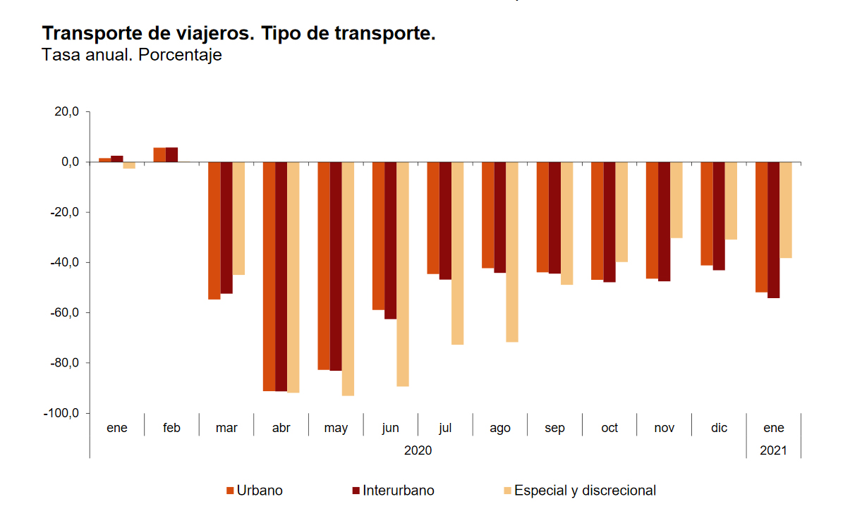 Durante el pasado mes de enero, más de 206,8 millones de viajeros utilizaron el transporte público un 51,1 por ciento menos que en el mismo mes del año 2020. El transporte urbano disminuyó un 51,9 por ciento en tasa anual y el interurbano lo hizo en un porcentaje del 54,2 por ciento en el primer mes del año.