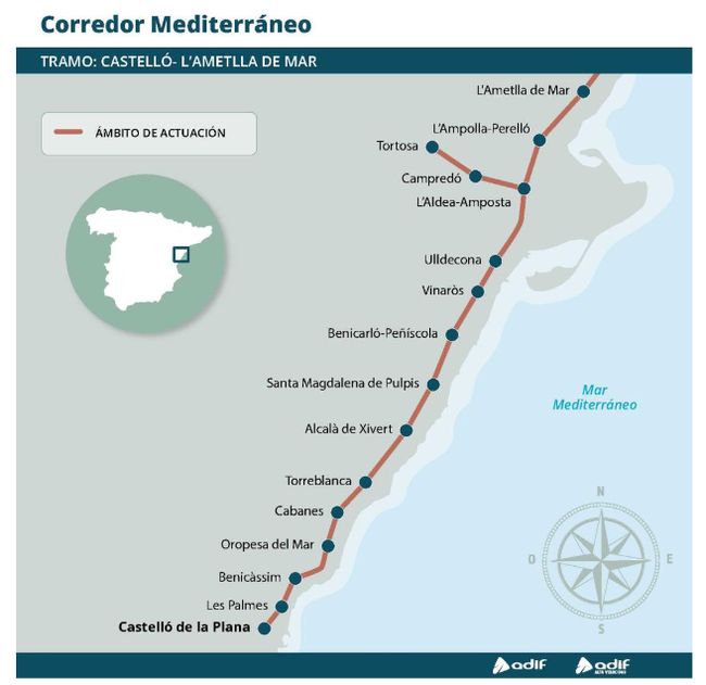 El ámbito del proyecto se desarrolla principalmente entre Castellón de la Plana y la localidad tarraconense de L'Ametlla de Mar, con una longitud de aproximadamente 155 kilómetros, y los 13 kilómetros del ramal entre las estaciones tarraconenses de Tortosa y L'Aldea/Amposta. En ambos tramos se instalará la tecnología de telecomunicaciones propia de las líneas de alta velocidad.