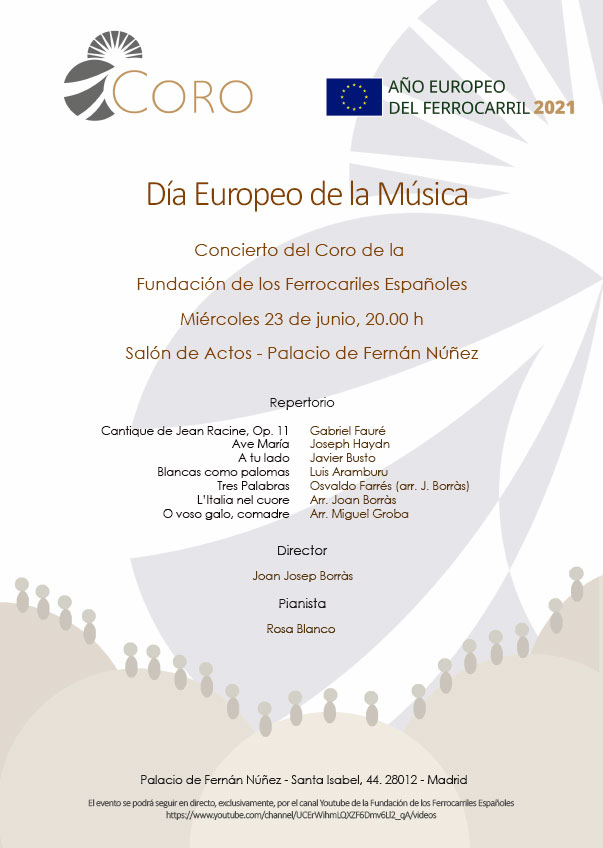 En el marco de la celebración del Día Europeo de la Música, mañana miércoles se celebrará en el Palacio de Fernán Núñez, un concierto del Coro de la Fundación de los Ferrocarriles Españoles.