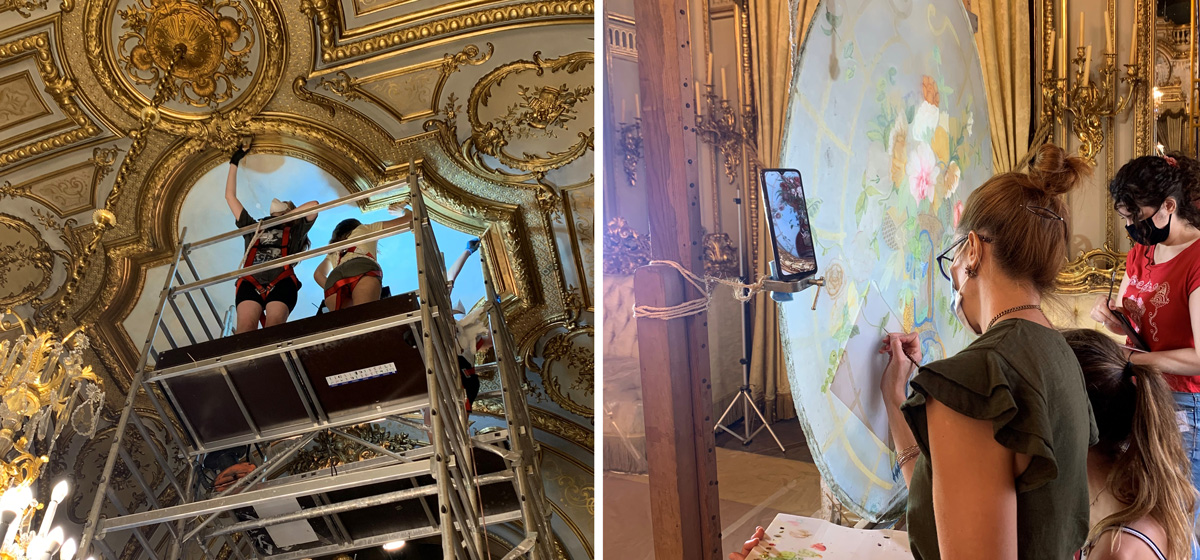 En el Salón de Baile trabajan en la pintura mural de tres por dos metros, aproximadamente, ubicada en el lateral derecho del techo. Se trata de una composición rectangular que representa el cielo algo nublado, pero con el característico azul del cielo madrileño. Es uno de los trampantojos principales de la gran bóveda de este salón, que invita a los visitantes a transportarse a las alturas.