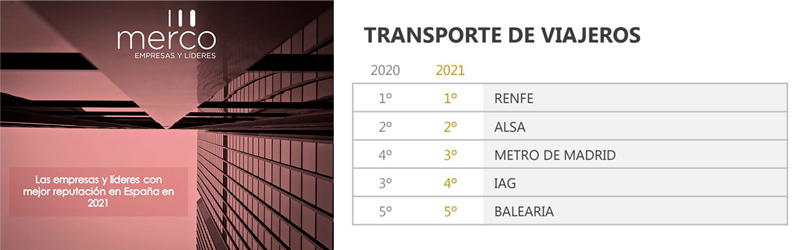 Por sexto año consecutivo, Renfe lidera el ranking como mejor empresa de transporte de viajeros en el informe del Monitor Empresarial de Reputación Corporativa (MERCO) “Empresas y Líderes España 2021” y ocupa el puesto 38 en el ranking general.