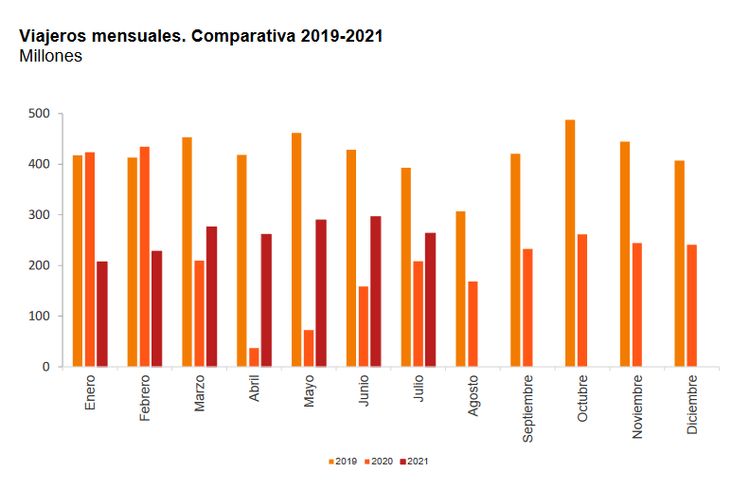 En los primeros siete meses de 2021 el número de viajeros se ha incrementado un 18 por ciento respecto al mismo periodo del año anterior, si bien todavía es casi un 40 por ciento inferior a los niveles pre-pandemia (año 2019).