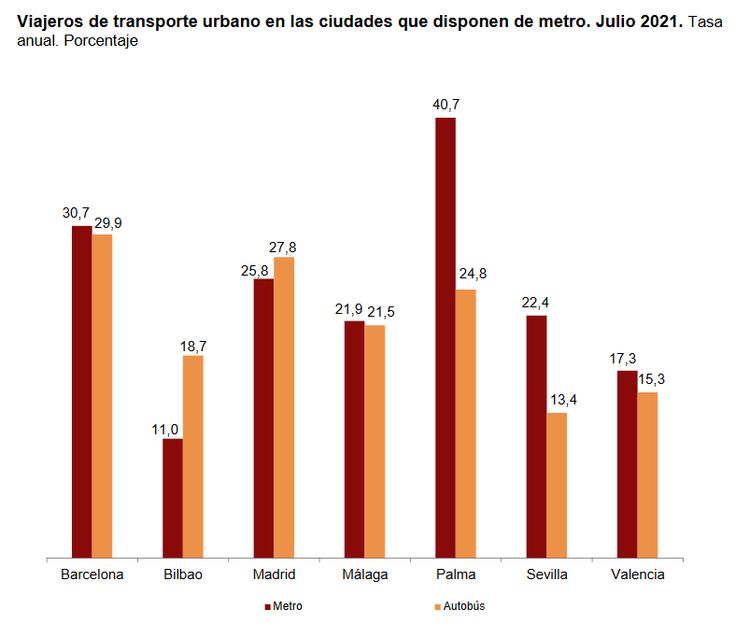 El transporte en metro creció en julio un 25,6 por ciento en tasa anual, con un total de 66.521.00 viajeros transportados e incrementos en las siete ciudades que disponen de este modo de transporte. Los metros de Palma y Barcelona fueron los que registraron mayores incrementos, con aumentos de usuarios del 40,7 y 30,7 por ciento, respectivamente.