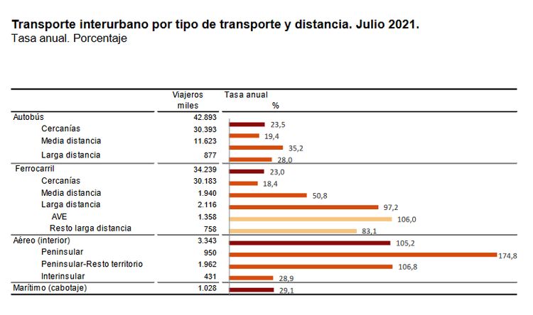En lo que respecta al transporte por ferrocarril, 34.239 000 personas lo utilizaron el pasado mes de julio, lo que supone un aumento del 23 por ciento en el séptimo mes del año. La subida más espectacular se registró en la demanda de los servicios de larga distancia, que aumentaron un 97,2 por ciento (2.116.000 usuarios) respecto a julio de 2020. Esta demanda se elevó hasta el 106 en el caso de los usuarios de los servicios AVE, utilizados por 1.358.000 viajeros en julio, mientras que el resto de trenes de larga distancia fueron utilizados por 758.000 viajeros, un 83,1 por ciento más que en julio del año anterior.