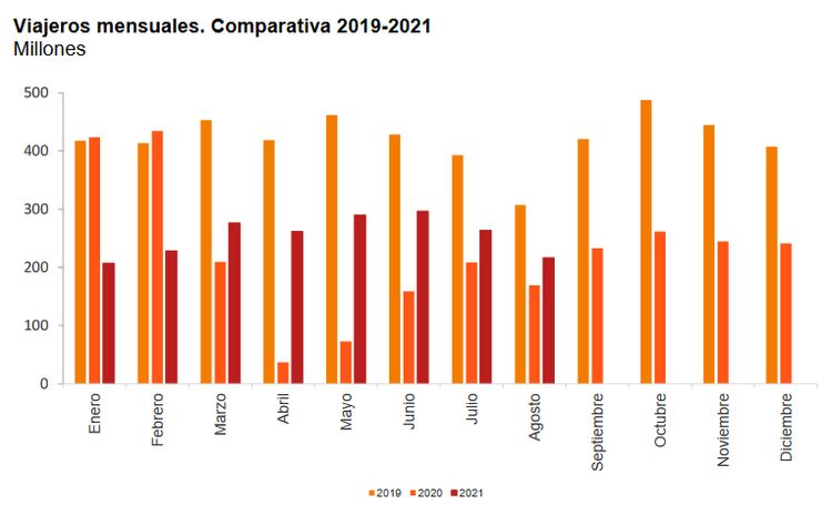 En los primeros ocho meses de 2021 el número de viajeros se ha incrementado un 18,9 por ciento respecto al mismo periodo del año anterior.