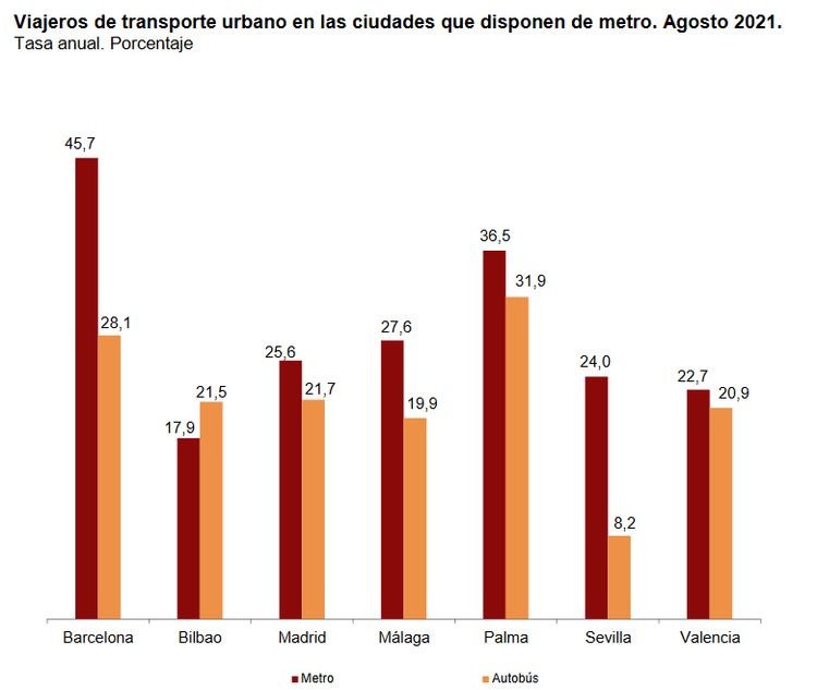 El transporte en metro creció en agosto un 31,3 por ciento en tasa anual, con un total de 52.173.00 viajeros transportados e incrementos en las siete ciudades que disponen de este modo de transporte. Los metros Barcelona y Palma fueron los que registraron mayores incrementos, con aumentos de usuarios del 45,7 y 36,5 por ciento, respectivamente.