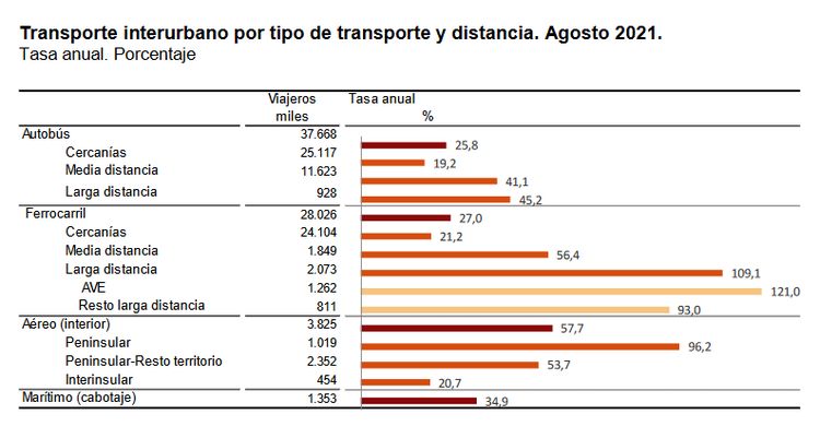 Los datos provisionales publicados por el Instituto Nacional de Estadística revelan que el número de viajeros del transporte público durante el pasado mes de agosto aumentó un 27,8 por ciento respecto al mismo mes de 2020. En lo que respecta al transporte por ferrocarril, la demanda creció un 27 por ciento en dicho mes, si bien se disparó hasta el 121 por ciento en el caso del AVE.