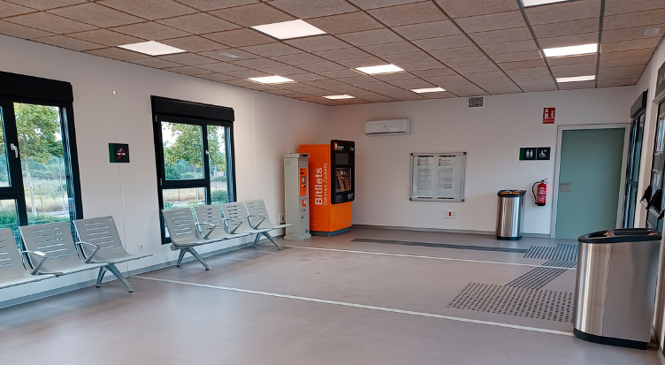 Este edificio dispone de varias dependencias destinadas a uso público. El vestíbulo principal, de 61,6 m2 de superficie, acoge la zona de espera de los viajeros, las máquinas de autoventa y de cancelación de billetes, así como las máquinas de vending. Por otra parte, se han habilitado dos aseos, de 6,5 m2 cada uno, adaptados para el uso por parte de personas de movilidad reducida y que, además, disponen de cambiador de bebés.