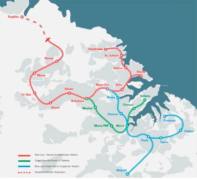 Transport Malta ha publicado el estudio de viabilidad para el desarrollo de una red de metro ligero sin conductor de 35 kilómetros de longitud, que prestaría servicio a la principal zona urbana alrededor de la capital, La Valeta. El coste estimado del proyecto asciende a más de 6.000 millones de euros
