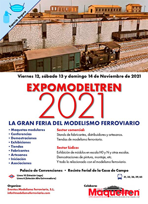 Desde hoy y hasta el próximo domingo se celebra en Madrid la feria Expomodeltren 2021. Se trata de un encuentro de modelismo ferroviario en el Palacio de Convenciones del Recinto Ferial de la Casa de Campo. El horario previsto es: hoy viernes de 17 a 20 horas, mañana sábado de 10 a 20 horas mientras que el domingo estará abierta de 10 a 14 h. Organiza: Eventos Modelismo Ferroviario y colabora la revista Maquetren.