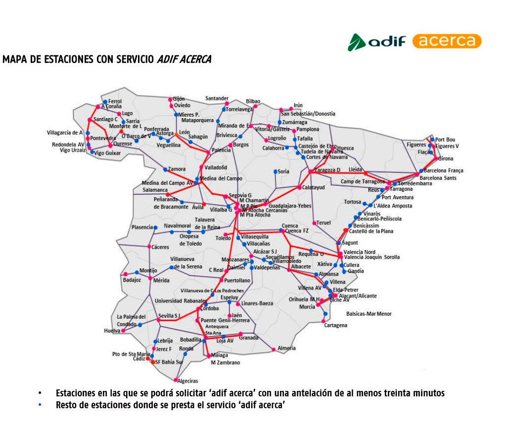 El servicio “Adif acerca” se presta en un total de 141 estaciones con tráficos de trenes de alta velocidad, larga distancia y media distancia repartidas por todo el país, y cuenta con alrededor de medio millar de asistentes de movilidad.