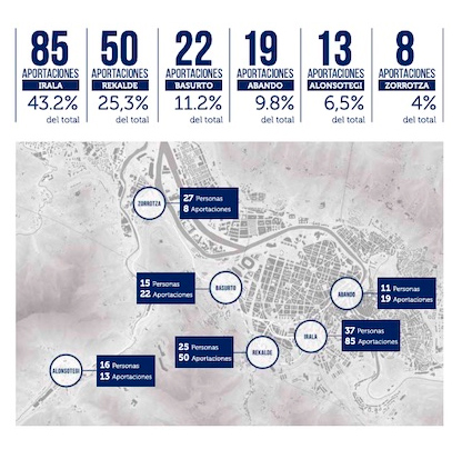 Un total de 131 personas han participado en las seis reuniones telemáticas celebradas en marzo con  residentes en Alonsotegi-Kastrexana, Zorroza, Basurto, Rekalde, Irala y Abando. En estos encuentros se han recogido 198 aportaciones. Además, 995 personas han respondido el cuestionario disponible en la web o en papel impreso en los centros de distrito.