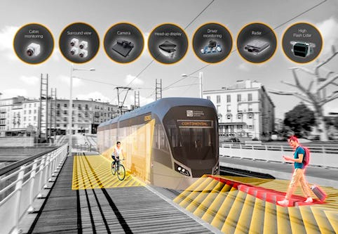 La información se ve en cabina como si estuviera ubicada a cierta distancia frente al vehículo, eliminando la necesidad de que el conductor tenga que enfocar constantemente. Esa visión frontal es especialmente útil cuando los tranvías operan en el centro de la ciudad, un entorno con muchos usuarios de la vía pública sin protección: ciclistas, motoristas y peatones con riesgo de distracciones por sus teléfonos móviles que según las estadisticas se está traduciendo en un número creciente de accidentes con tranvías.