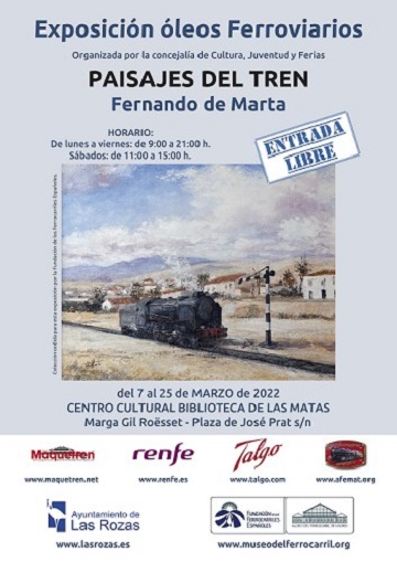 La Fundación de los Ferrocarriles ha cedido óleos de temática ferroviaria al Ayuntamiento de Las Rozas para la exposición ‘Paisajes del Tren’, que reúne veinticinco cuadros del artista Fernando de Marta. La muestra está abierta al público hasta el 25 de marzo en el Centro Cultural Biblioteca de Las Matas ´Marga Gil Roësset´.