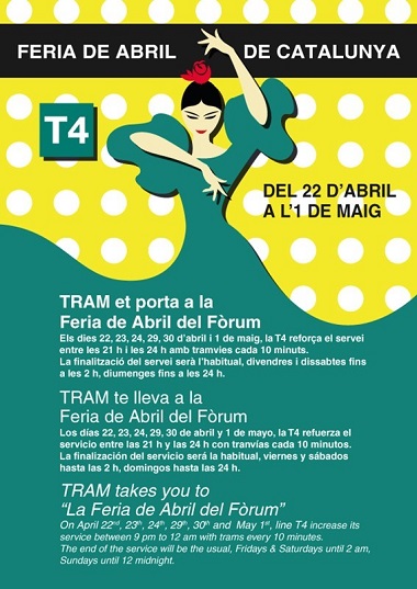 RAM reforzará el servicio de la línea T4 de Trambesòs por la Feria de Abril de Cataluña, que se celebra desde este viernes 22 de abril y hasta el domingo 1 de mayo en el Fòrum. Las frecuencias de paso aumentarán durante las noches y madrugadas de los días 22, 23, 24, 29, 30 de abril y 1 de mayo, entre las 21:00 y las 24:00 horas, con tranvías cada diez minutos.