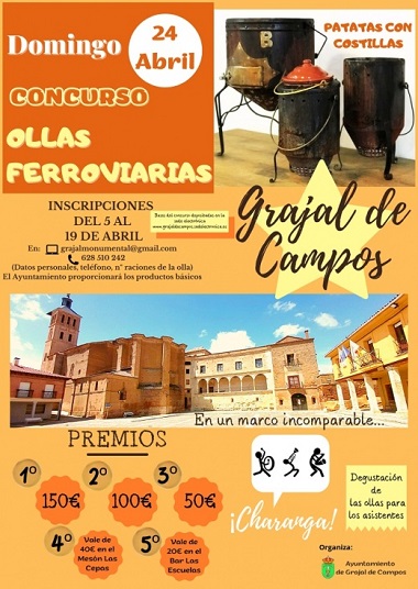 El domingo 24 de abril, Grajal de Campos acoge el concurso de “Ollas ferroviarias”. Esta cita es una oportunidad de conocer este pueblo leonés y su característico paisaje con grandes llanuras onduladas, además de disfrutar de un sabroso guiso cocinado a fuego lento en las ollas de hierro ferroviarias.