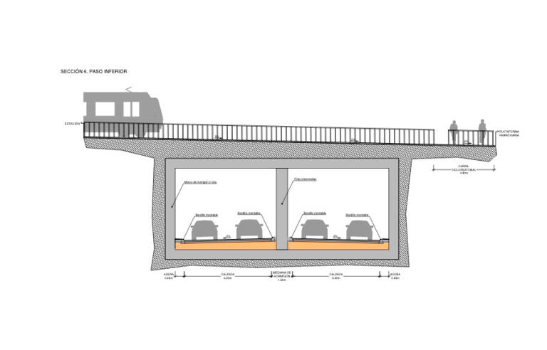 La supresión de dicho paso a nivel permitirá eliminar la barrera que constituyen las vías para el acceso a la ciudad. El nuevo paso inferior dispondrá de una sección tipo de dos carriles por sentido con mediana central, mientras que los itinerarios para ciclistas y peatones se conservarán en la superficie.
