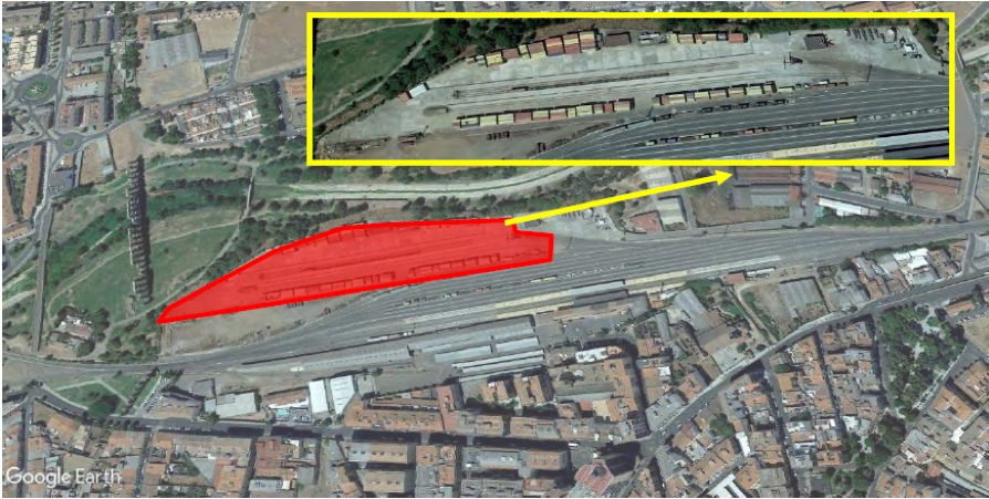 - Zona de operaciones para tratamiento Intermodal de los trenes, estocaje y transferencia a camión, con tres vías interiores dotadas de toperas . Este espacio es objeto del contrato ahora licitado..