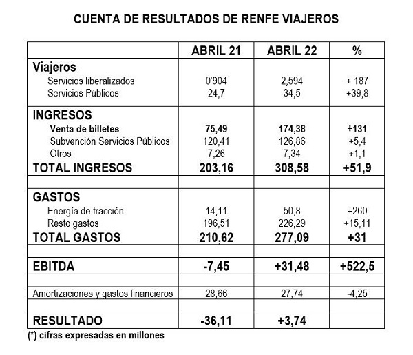 Respecto a los servicios públicos de Cercanías y Media Distancia, se ha conseguido casi diez millones de viajeros más en abril, de 2022 ya que se ha pasado de 24’7 millones a 34’5 millones de pasajeros, cifra que supone un incremento del 39,8 por ciento. En lo que se refiere a los ingresos por la venta de billetes, comparando el mes de abril de 2021 y 2022 se ha pasado de 75,49 a 174,38 millones de euros, un 131 por ciento más.