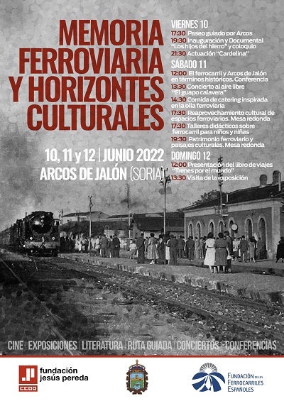 El espacio Cultural de Arcos de Jalón, es la sede de las jornadas “Memoria ferroviaria y Horizontes culturales”, que se celebran del 10 al 12 de junio. El programa incluye una ruta guiada por la localidad, un documental, conciertos, una conferencia, dos mesas redondas, la presentación de un libro de viajes en tren por todo el mundo, además de una exposición con fotos y objetos ferroviarios y una comida inspirada en la olla ferroviaria.