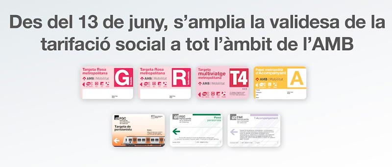 El Área Metropolitana de Barcelona, AMB, y Ferrocarrils de la Generalitat de Catalunya, FGC, han extendido su tarificación social del transporte público a los dieciocho municipios de la segunda corona metropolitana de Barcelona. Hasta ahora la tarificación social del estaba vigente únicamente en los dieciocho municipios de la primera corona tarifaria, en los servicios de Metro, autobuses, FGC y Tram.