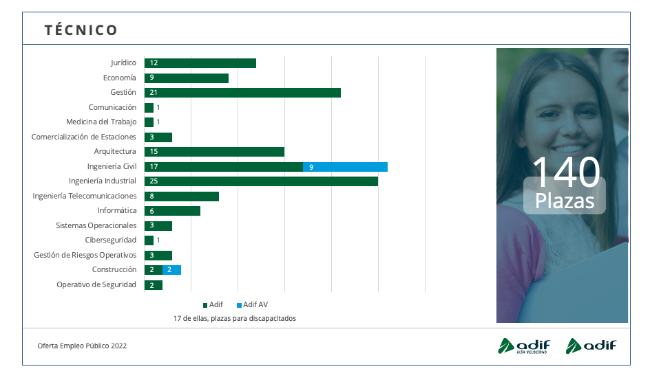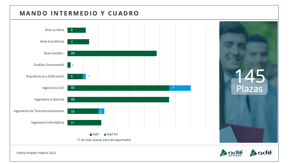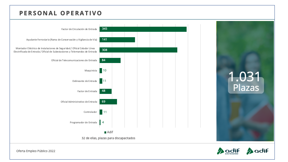 Adif y Adif AV incorporarán con el lanzamiento de esta nueva convocatoria de Oferta de Empleo Público un total de 1.316 profesionales. De estos, el 78,3 por ciento corresponden a personal operativo; un 10,7 por ciento, a categoría profesional de técnico y un 11 por ciento, a mandos intermedios y cuadros técnicos.