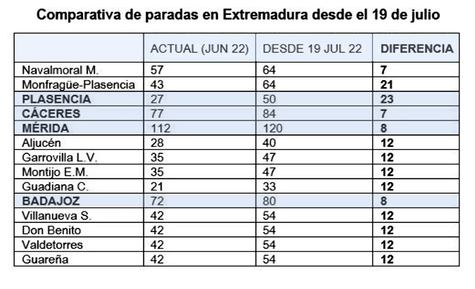 Otra de las mejoras es que el número de servicios se incrementará en catorce localidades de la región, y es Plasencia donde más aumenta el número de paradas, al centrar su actividad en los trenes de Media Distancia y Regionales con un incremento de veintitrés semanales, que pasa de las 27 de antes a las cincuenta de ahora. En segundo lugar se sitúa la de Monfragüe-Plasencia donde también se aumentan las llegadas de 43 a 64.