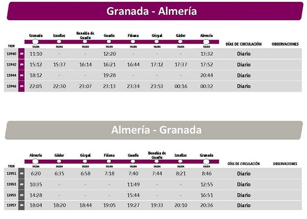 La operadora refuerza las conexiones entre ambas ciudades con una cuarta frecuencia de Media Distancia. La salida diaria de Almería será a las 6:20 horas para facilitar los desplazamientos entre distintas localidades de esta provincia, como Gádor, Gérgal y Fiñana, y otras de Granada, como Guadix e Iználloz. Desde Granada, se añade una frecuencia diaria que saldrá, a partir del 20 de febrero, a las 11:10 horas y realizará una parada intermedia en Guadix.