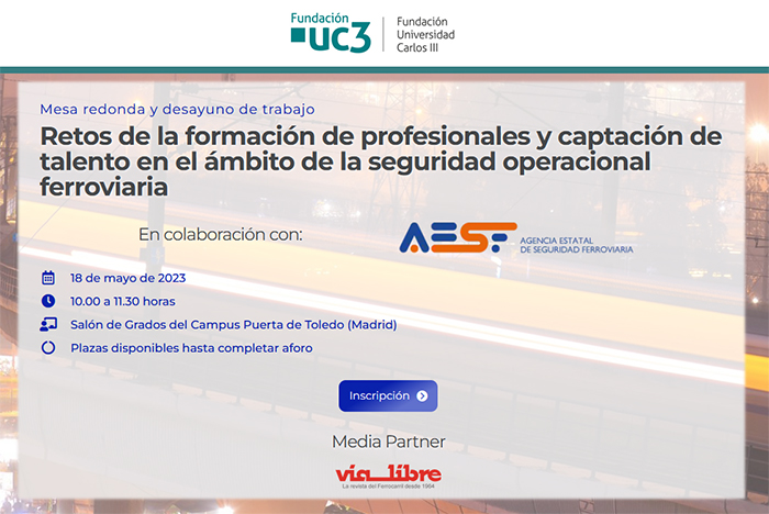 El próximo 18 de mayo se celebra en Madrid una jornada sobre la formación de profesionales en seguridad ferroviaria organizada por la Fundación Universidad Carlos III en colaboración por la Agencia Estatal de Seguridad Ferroviaria