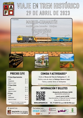 El 29 viajará a Valdepeñas el “Tren de los Viñedos”, una iniciativa organizada por Asociación de Amigos del Ferrocarril de Madrid. El viaje será a bordo del “Tren de los Ochenta” y con la 333-107 al frente, partirá de Chamartín a primera hora de la mañana, recogiendo viajeros en Aranjuez antes de enfilar los infinitos campos de La Mancha. Dentro, servicio de cafetería y, una vez en Valdepeñas, los viajeros podrán unirse a una de las visitas a una de las bodegas de la zona -con su correspondiente cata de vinos- y al Museo del Vino
