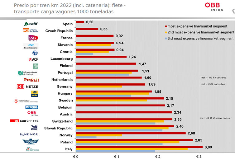 Con el mantenimiento de esta estrategia en los últimos años, los cánones ferroviarios en España están alineados e, incluso, se encuentran en algunos corredores por debajo de los establecidos en otros mercados europeos: de hecho, se sitúan en niveles similares a Alemania y muy por debajo de Francia en el corredor Madrid-Barcelona, según datos de la Comisión Nacional de Mercados y Competencia y los propios de Adif y Adif AV. que también constatan que, en el Corredor Levante, los niveles son equivalentes e incluso inferiores a Italia; y se sitúan en un tramo intermedio-bajo, en caso del corredor Madrid-Andalucía.