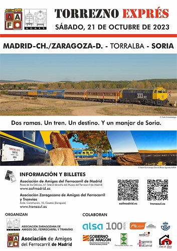 La Asociación de Amigos del Ferrocarril de Madrid y la Asociación Zaragozana de Amigos del Ferrocarril y Tranvías, en colaboración con Alsa, organizar conjuntamente un viaje a Soria con el “Tren Azul” y el “Tren de los 80”. Las dos asociaciones unen sus trenes para mostrar una colección de vehículos históricos en los que viajar desde los años 20 hasta el siglo XXI, desde coches postales hasta lujosos restaurantes sobre ruedas de la legendaria Compañía Internacional de Coches Cama, pasando por los primeros coches de viajeros modernos de la red. Cada tren saldrá de su respectiva base, para recorrer la línea de la antigua compañía Madrid-Zaragoza-Alicante hasta Torralba del Moral, ya en la provincia de Soria. En esta pequeña población que separa los valles del Jalón y del Henares se unirán ambos trenes, mientras los viajeros disfrutarán de un pequeño almuerzo con auténticos torreznos. Posteriormente, se emprenderá el camino por la línea Torralba-Soria hasta la capital castellana a orillas del Duero. El precio incluye billete de ida y vuelta, y almuerzo con torrezno en Torralba del Moral.