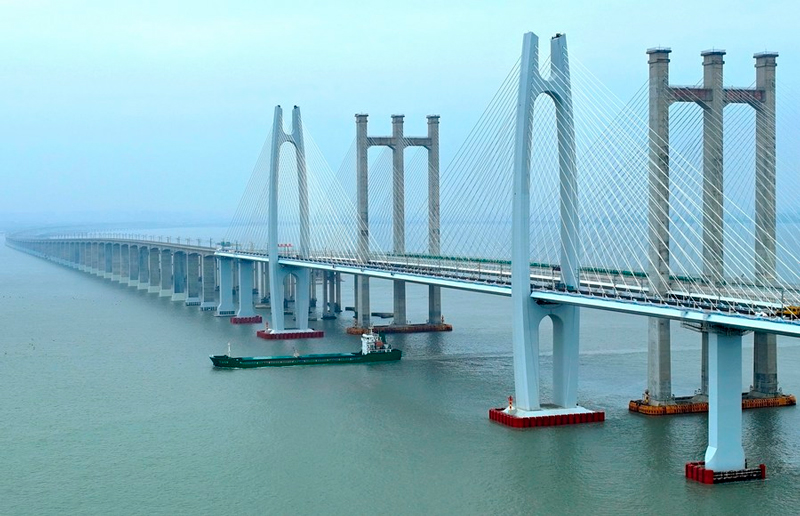 El puente sobre la bahía de Meizhou, de 14,7 kilómetros, es el primer puente atirantado estradosado de un ferrocarril de alta velocidad del país que cruza el mar. El puente de la bahía de Quanzhou está reforzado con estructuras y tecnologías a prueba de viento para permitir que los trenes pasen a la máxima velocidad incluso con vientos de grado 8.
