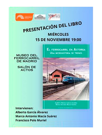 El salón de actos de Museo del Ferrocarril de Madrid acogerá mañana miércoles 15 de noviembre, a las 19.00 horas la presentación del libro ‘El Ferrocarril de Astorga. Una microhistoria de trenes’, cuyos autores son Alberto Matías García Álvarez y Marco Antonio Macía Suárez.
