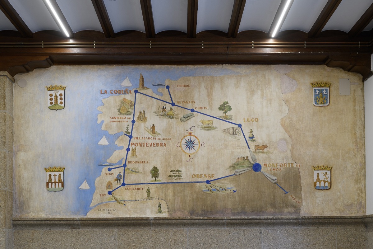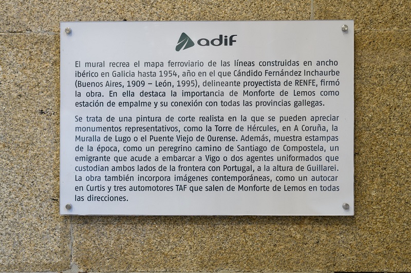 Adif ha restaurado el mural ferroviario del vestíbulo de la estación de Monforte de Lemos en Lugo, todo un documento histórico que recrea el mapa ferroviario de las líneas existentes en ancho ibérico en Galicia en 1954, año en que Cándido Fernández Inchaurbe, delineante proyectista de Renfe, firmó la obra.
