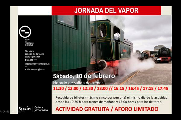 Mañana sábado se celebra en el museo de Gijón la jornada del vapor con salidas por la mañana y por la tarde. Se trata de una actividad gratuita donde los billetes se pueden adquirir desde las 10,30 h para las salidas por la mañana y desde las 15 h para las de por la tarde.