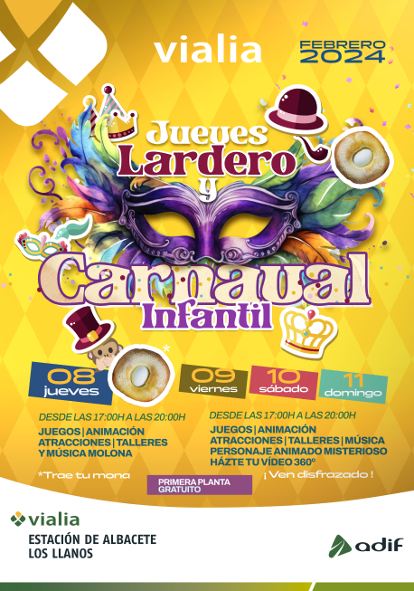 La estación de Adif vialia Albacete Los Llanos acogerá la celebración del Carnaval infantil, del 9 al 11 de febrero. la gama de actividades se amplía con el juego del personaje disfrazado misterioso y la posibilidad de elaborar vídeos de 360º en una plataforma de creación multimedia. Toda la programación, de carácter gratuito, se desarrollará, de 17:00 a 20:00 horas, en la primera planta del centro comercial.