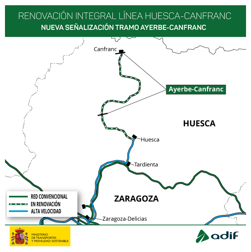 Las actuaciones en esta línea, clave para el transporte de Zaragoza y Huesca al Pirineo aragonés y la conexión internacional con Francia, para la que se trabaja en los estudios para la implantación del ancho estándar en el tramo Huesca-Canfranc, con el objetivo de la reapertura de la línea Zaragoza-Canfrac-Pau.