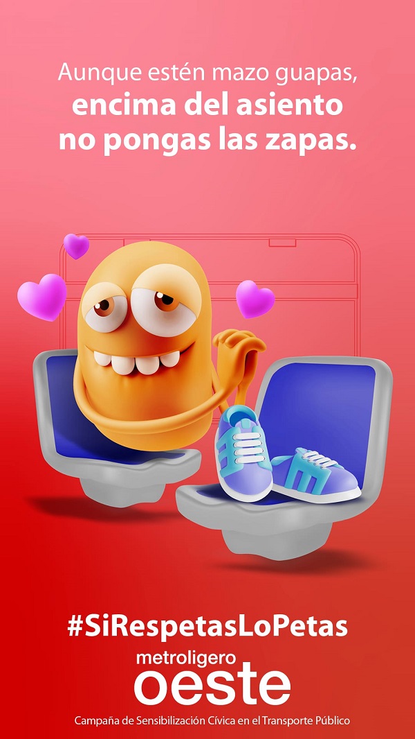 La nueva campaña cívica de Metro Ligero Oeste (MLO) se ha diseñado para concienciar a los pasajeros sobre el buen uso del transporte público. En esta ocasión, se han apoyado en piezas de estilo desenfadado para llegar a los jóvenes usuarios de los centros escolares colindantes que utilizan a diario el servicio. En esta línea, se ha optado por utilizar emoticonos para ilustrar situaciones y mensajes cercanos, con un lenguaje cotidiano para destacar la importancia de cuidar y comportarse adecuadamente en los trayectos y en las instalaciones del metro ligero, que es un espacio compartido por todos los usuarios. Además, se han tenido en cuenta las sugerencias realizadas por los usuarios para contribuir a una mejor convivencia entre todos, tanto en las instalaciones como a bordo de los vehículos de MLO.
