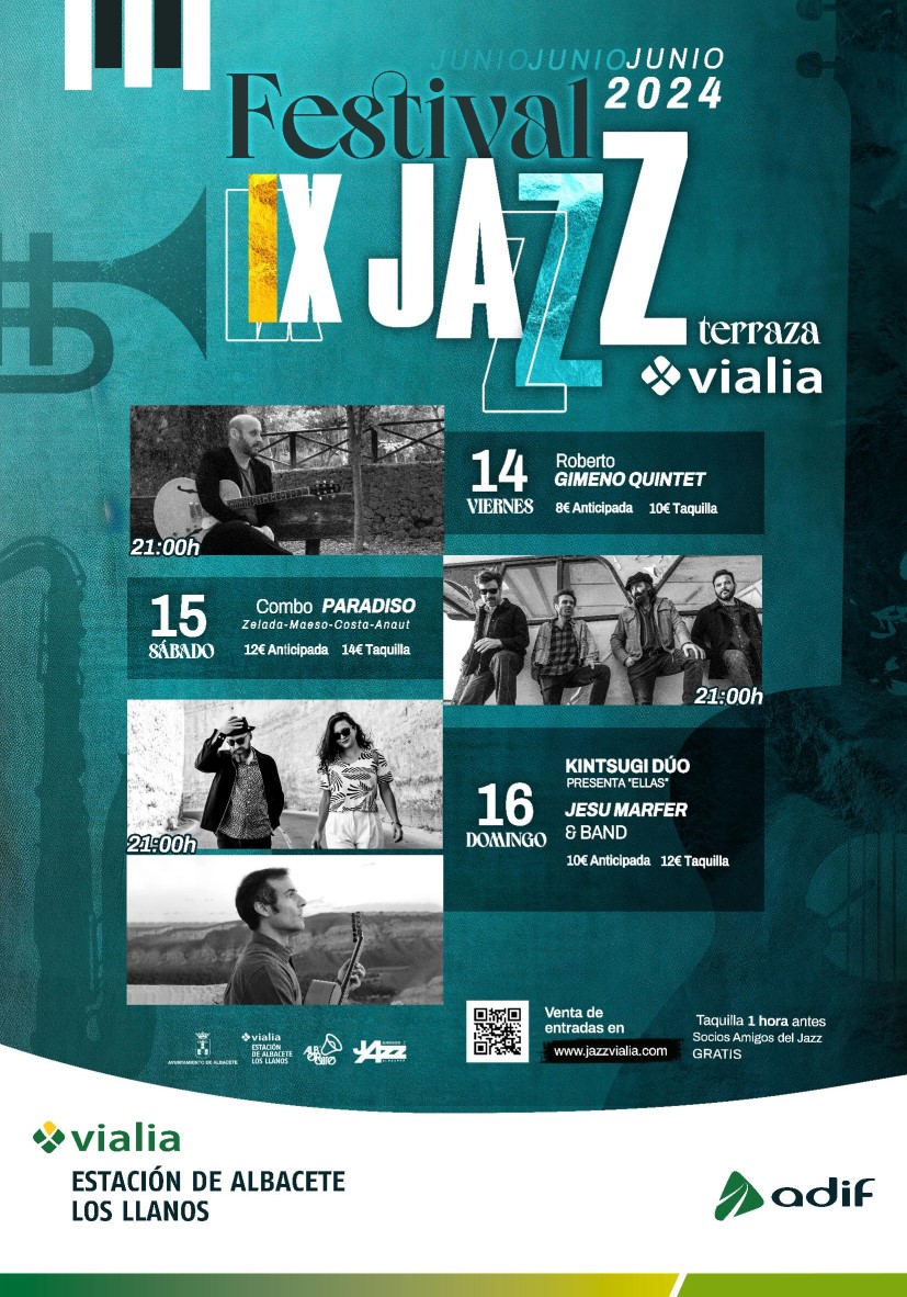 La estación de Adif Vialia Albacete Los Llanos será el escenario de la IX Edición del ‘Festival de Jazz Terraza Vialia’ durante el fin de semana del 14 al 16 de junio, en el marco de las Fiestas de San Juan. Este evento al aire libre ofrecerá una variada gama de actuaciones de jazz. El festival comenzará el viernes con el quinteto de Roberto Gimeno, continuará el sábado con Combo Paradiso presentando su nuevo disco, y concluirá el domingo con las presentaciones de Kintsugi Dúo y Jesu Marfer & Band. Las sesiones se realizarán a las 21:00 horas en la fachada principal del centro comercial.