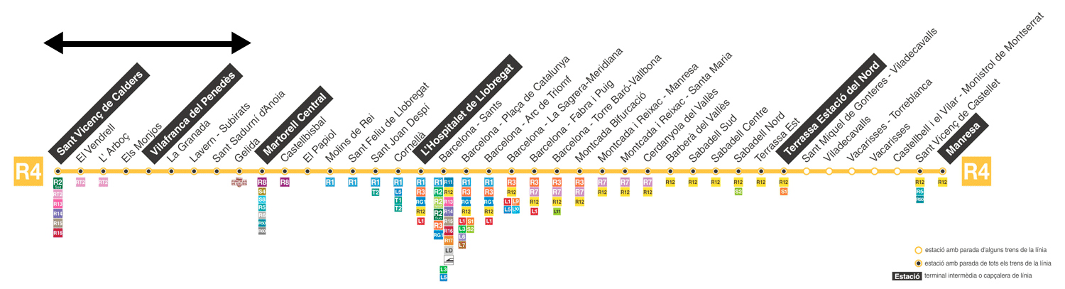 Los servicios recuperan su programación habitual en días laborales entre Sant Vicenç de Calders y Vilafranca del Penedés. Durante los fines de semana se mantienen las mismas frecuencias excepto algunos del mes de agosto por las obras de adaptación a ancho estándar que Adif ejecuta entre Catellbisbal y Molins de Rei. La línea R4, de 143 kilómetros y cuarenta estaciones, cubre el trayecto entre St. Vicenç de Calders y Manresa por Vilafranca del Penedes.
