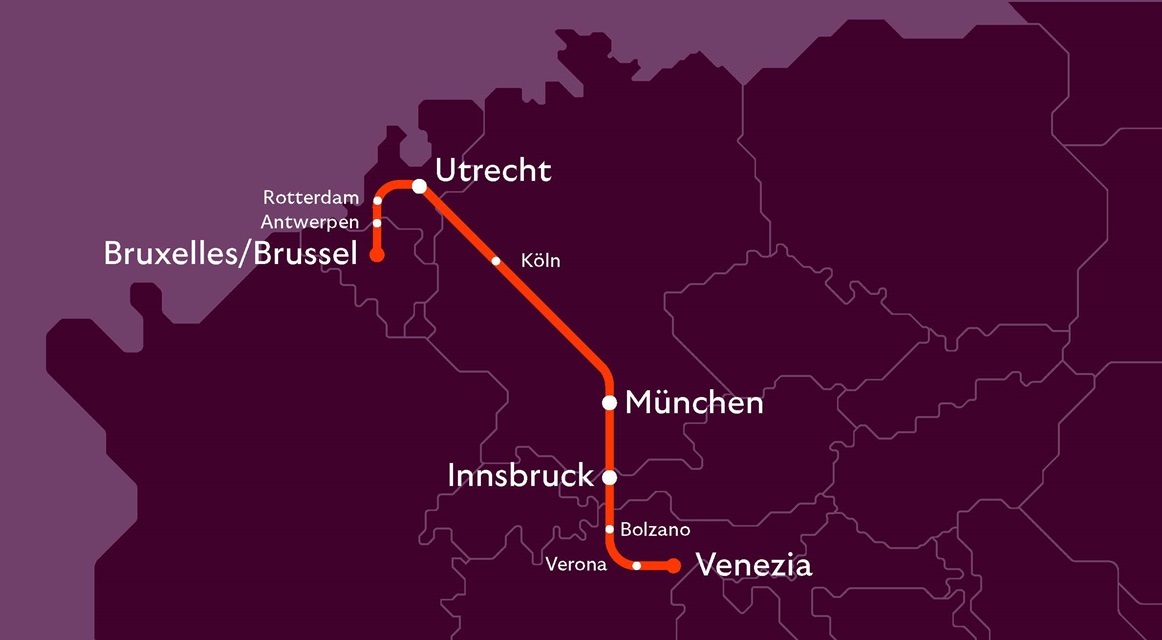 La ruta estacional comenzará en Bruselas y finalizará en Venecia, nuevo destino de la compañía belga-holandesa. El viaje nocturno llevará a los pasajeros a través de Bélgica, los Países Bajos, Alemania y Austria, antes de finalizar en Italia.  En el camino hará escala en Amberes, Rotterdam, Utrecht, Colonia, Múnich, Innsbruck y Verona.