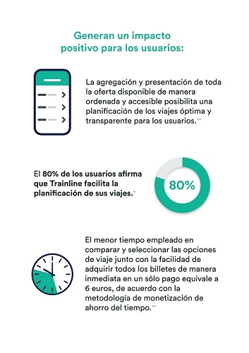 Otra de las conclusiones es que las “aplicaciones de venta de billetes impulsan un mercado ferroviario más competitivo y los beneficios asociados en términos de mejores precios y más opciones a disposición de los usuarios”. En este sentido, un 80 por ciento de los usuarios de Trainline afirma que la plataforma facilita la planificación de sus viajes al ayudarles a encontrar las mejores opciones y conexiones al mejor precio disponible. Además, uno de cada dos usuarios que reservaron un viaje con un nuevo operador ferroviario declara que conoció su existencia y servicios por primera vez en la plataforma.