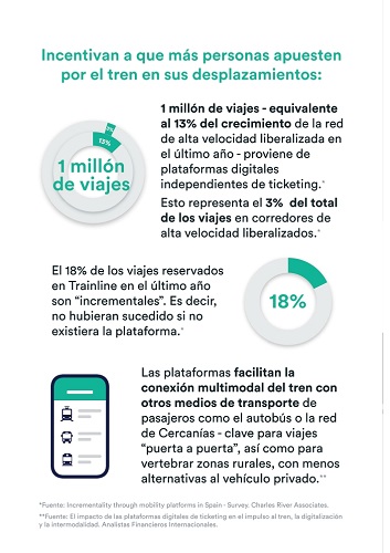 En esta línea, el informe de Charles River Associates presentado por Trainline señala que un 3 por ciento de los viajes, equivalente a 1 millón de trayectos, se ha producido por la actividad de las plataformas digitales independientes. Según Trainline, las cifras revelan el papel dinámico de las plataformas de venta de billetes de tren en el mercado, contribuyendo al aumento de los viajes en tren en general, y de forma aún más significativa en los corredores de alta velocidad abiertos a la competencia. El estudio considera que el 18 por ciento de los viajes reservados en Trainline son incrementales, es decir generados directamente por la actividad de la plataforma y no se habrían producido de otro modo.