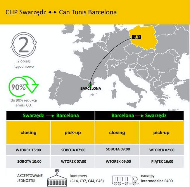 El operador polaco CLIP Group ha puesto en marcha un servicio ferroviario entre su terminal de Swarzedz, en Polonia, y la de Can Tunis, en Barcelona. La composición, para contenedores y semirremolques intermodales, tiene capacidad para 38 utis y la tracción está a cargo de Captrain.